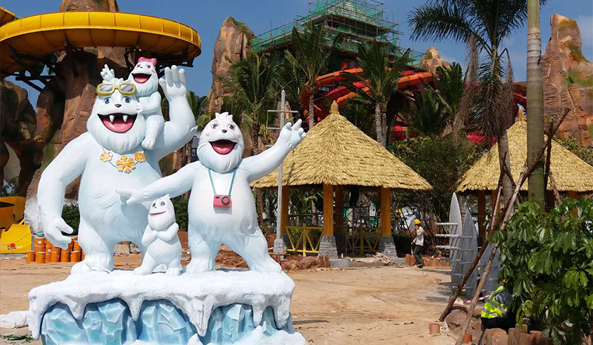 走近水上王國(guó),首先會(huì)看到有個(gè)勇士沖浪通道,上面有座仿真茅草亭子,接著就會(huì)被一座巍峨的雪山所吸引,這里是喜馬拉雅雪人的家鄉(xiāng),跟隨雪人可以攀上高峰,參觀(guān)山頂?shù)幕┬∥?,在雪人?/p>
